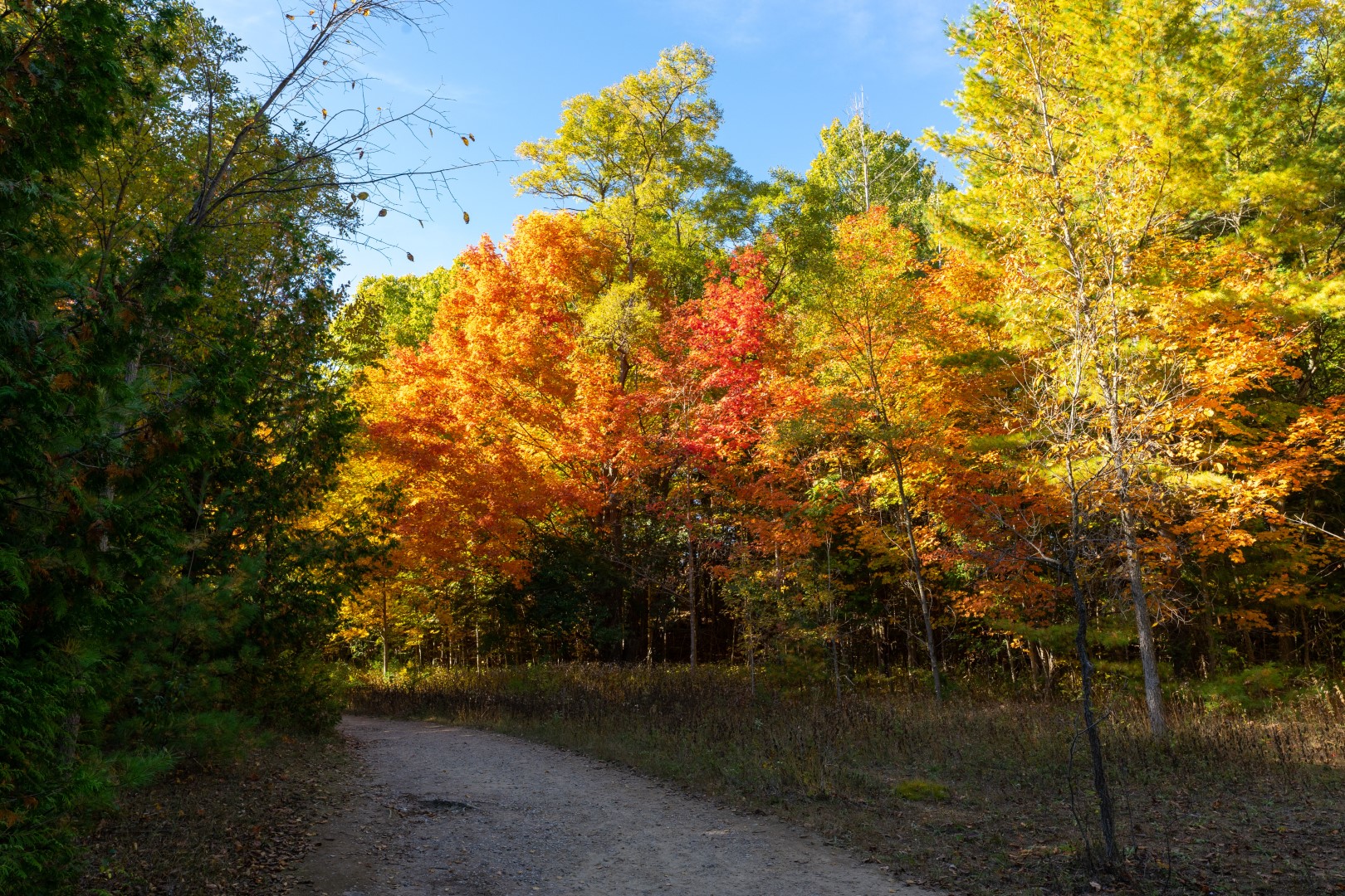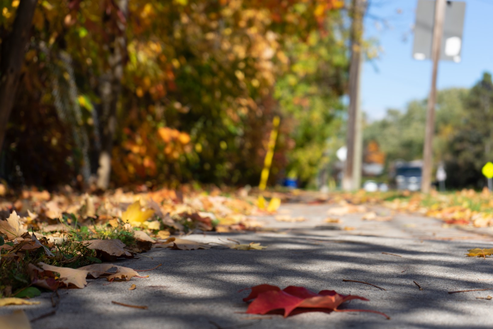 Maple leaves scatter on the trail in Pomona Mills Park.